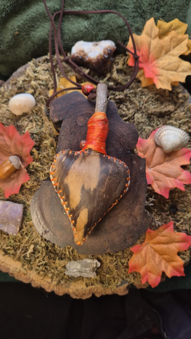 Shaped in the newly introduced Orva-Oddr form, this Stag hide Shamanic Necklace Rattle carries the steady strength, intuition, and protective presence of the Stag. A guide of resilience and spiritual awareness, Stag energy supports those seeking grounding, clarity, and deeper connection during healing or ritual work.